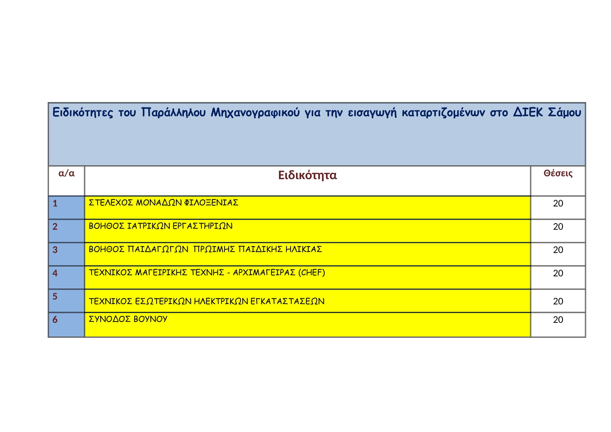 Ειδικότητες του Παράλληλου Μηχανογραφικού για την εισαγωγή καταρτιζομένων στο ΔΙΕΚ Σάμου